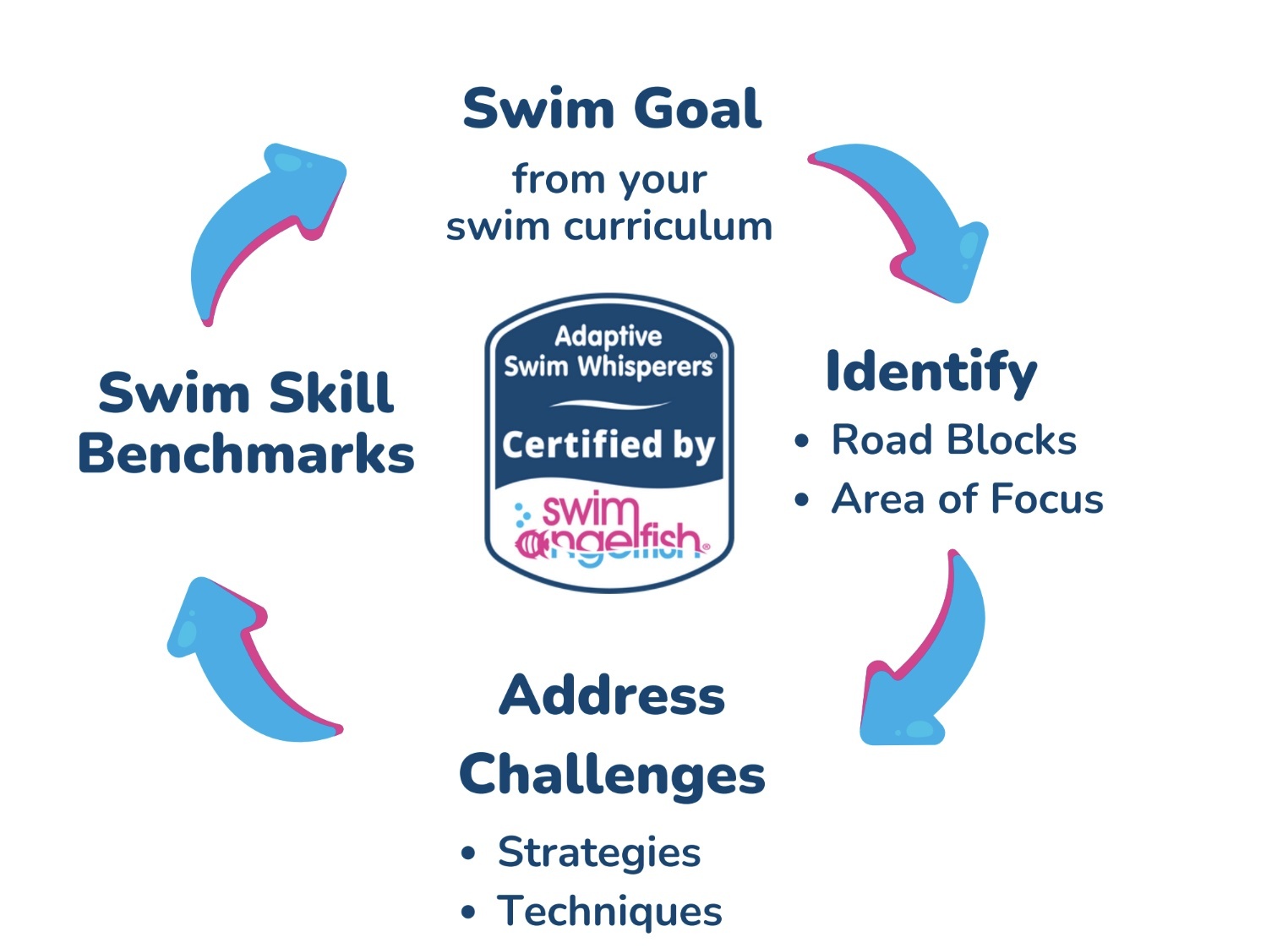 Swim Whisperers® is more than a set of modifications; it’s a proven system for assessing, identifying and solving the Physical, Motor, Sensory, and Emotional Roadblocks that typically stop progress, by implementing Swim Whisperers® strategies and adapting your approach.